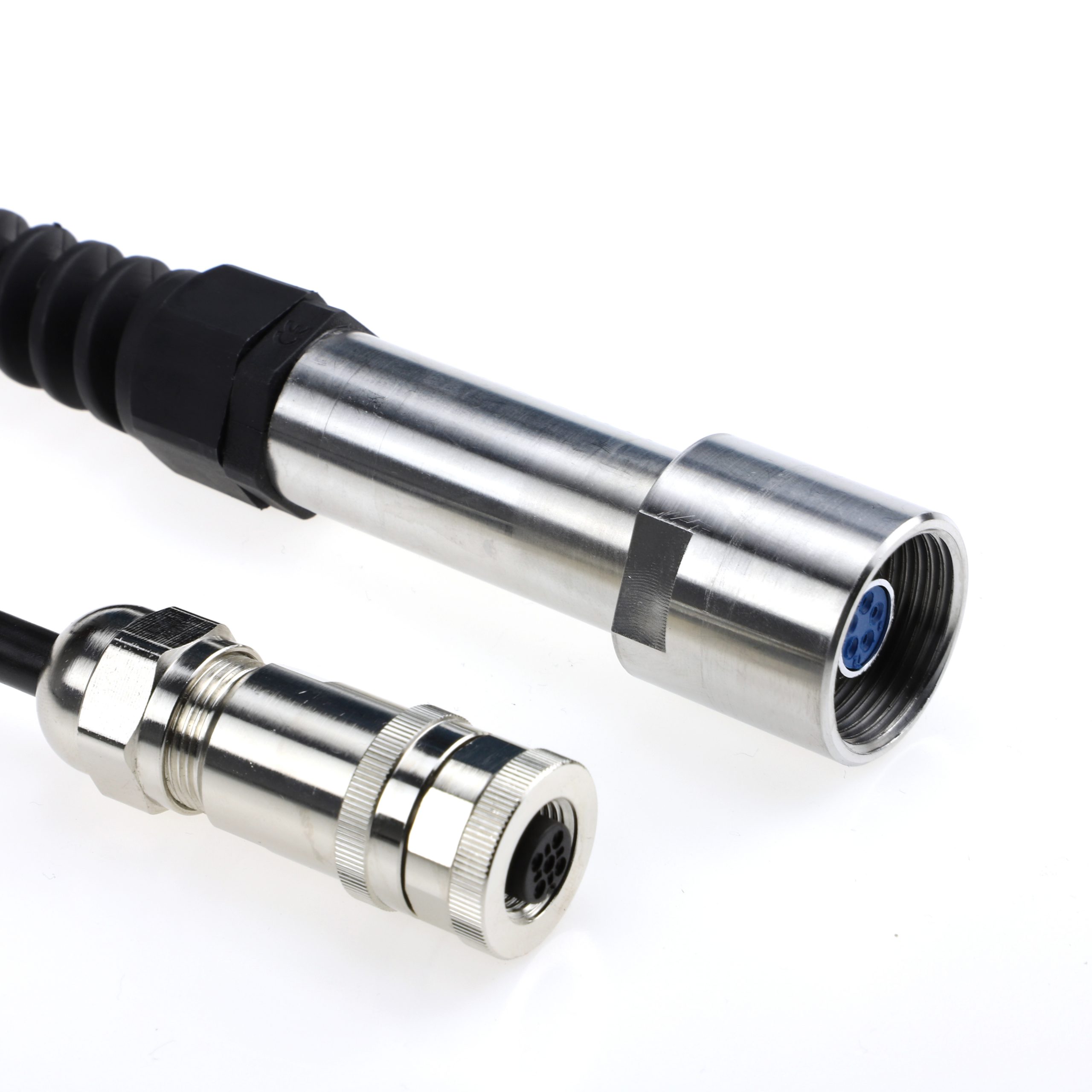 與探頭連接的接插件 ,是防水設(shè)計(jì), 可以承受最多150米水深 而不進(jìn)水。另一端與顯示器連接的接插件, 防護(hù)等級(jí)IP67, 可以在1米水下不進(jìn)水, 兩種接插件都是不銹鋼外殼材質(zhì), 耐腐蝕,防銹。均為5芯接插件,探頭端接插件外徑28mm, 顯示器端18mm,由于采取了特殊結(jié)構(gòu), 預(yù)防了通常容易出現(xiàn)的接頭漏水,用黑膠布包扎的現(xiàn)象,直川公司產(chǎn)品不存在這種情況,用戶可以放心使用。