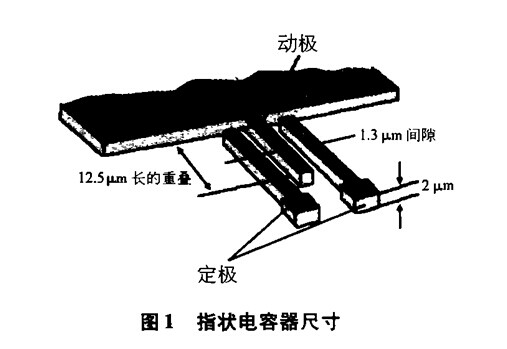? ? ? ?每個(gè)指狀電極的電容正比例于固定電極和移動(dòng)電極之間的重疊面積以及移動(dòng)電極的位移。顯然,這些都是很小的電容器,并且,為了降低噪聲和提高分辨力,實(shí)際上需要盡可能大的差動(dòng)電容。