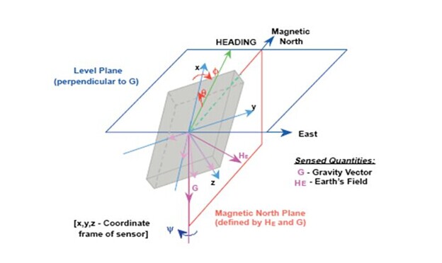 用地磁場在X和Y的兩個(gè)分矢量值便可確定方位值: