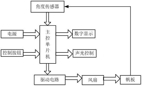 當(dāng)用手控制帆板時(shí),顯示屏能夠?qū)崟r(shí)顯示帆板的轉(zhuǎn)角,可顯示范圍為0°~90°;當(dāng)通過操作鍵盤給單片機(jī)傳送加速指令,風(fēng)扇速度由零逐漸增大到最大風(fēng)速,帆板與豎直面的偏轉(zhuǎn)角度相應(yīng)的由0°增大到60°,顯示屏也實(shí)時(shí)顯示傾角度數(shù);當(dāng)需要帆板偏轉(zhuǎn)到某個(gè)固定角度時(shí),通過鍵盤輸入角度值,單片機(jī)通過分析控制風(fēng)扇轉(zhuǎn)速,使帆板的偏轉(zhuǎn)角度逐漸達(dá)到設(shè)定值,并實(shí)時(shí)對帆板角度進(jìn)行修正,當(dāng)帆板轉(zhuǎn)動接近預(yù)定的角度(±3°)時(shí)會發(fā)出聲光提示。
