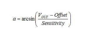 其中,VOUT為傾角傳感器輸出腳模擬電壓,offset是設(shè)備在0g位置時(shí)的電壓輸出(一般輸出值為2.5v),Sensitivity是設(shè)備的靈敏度(通常靈敏度為2v/g)。為得到最準(zhǔn)確的精確度,應(yīng)當(dāng)用實(shí)際輸出值代替通常值。