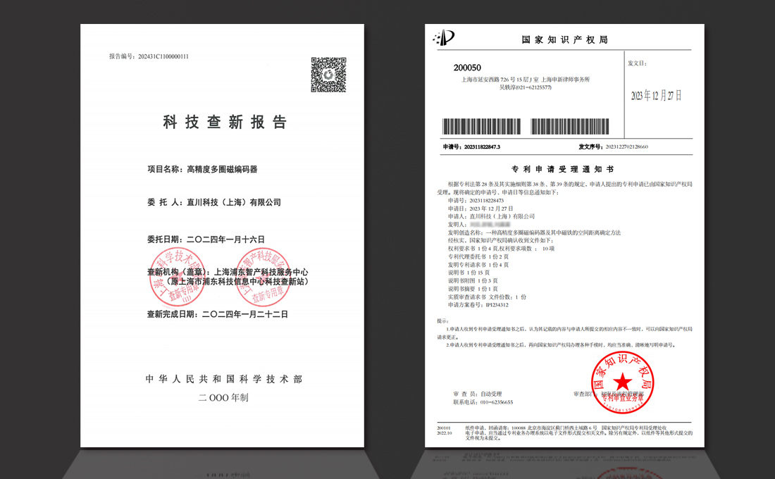 ? ? ? ?多圈磁編碼器作為直川科技的核心產(chǎn)品之一,一直以來都以其高精度、長壽命、高可靠性和強抗干擾能力而受到市場的廣泛認可。面對激烈的市場競爭和不斷升級的客戶需求,我們從未停止追求卓越的步伐。經(jīng)過持續(xù)研發(fā)和技術(shù)創(chuàng)新,直川科技成功突破了多項關(guān)鍵技術(shù)難題,將多圈磁編碼器的精度提升到了一個新的高度。這項技術(shù)已經(jīng)申請了發(fā)明專利,目前已受理,發(fā)明名稱:一種高精度多圈磁編碼器及其中磁鐵的空間距離確定方法,申請?zhí)枺?02311822847.3。