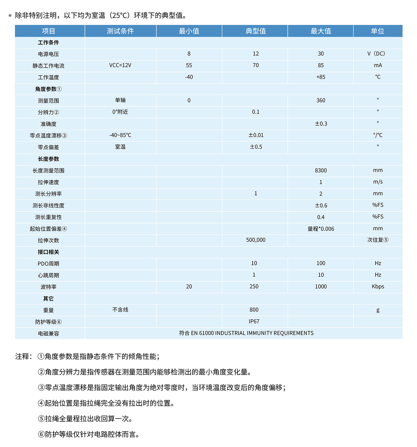 ZCW-FSD-M2-WxxxA1360是直川科技(上海)有限公司研發(fā)生產的冗余型長角傳感器。產品的拉繩最大量程8300mm,單軸傾角量程0~360°,CAN信號輸出,兼容CANopen協(xié)議。產品拉繩測長采用磁編碼原理,體積小,集成度高,使用壽命長。