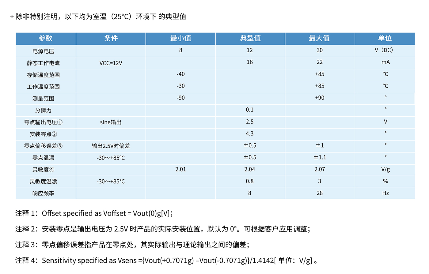 ? ? ? ? ? 該傳感器為直川科技研發(fā)生產(chǎn)。本產(chǎn)品是單軸結(jié)構(gòu),8~30V 寬電壓供電,量程 ±90 度,sin 曲線模擬電壓輸出。